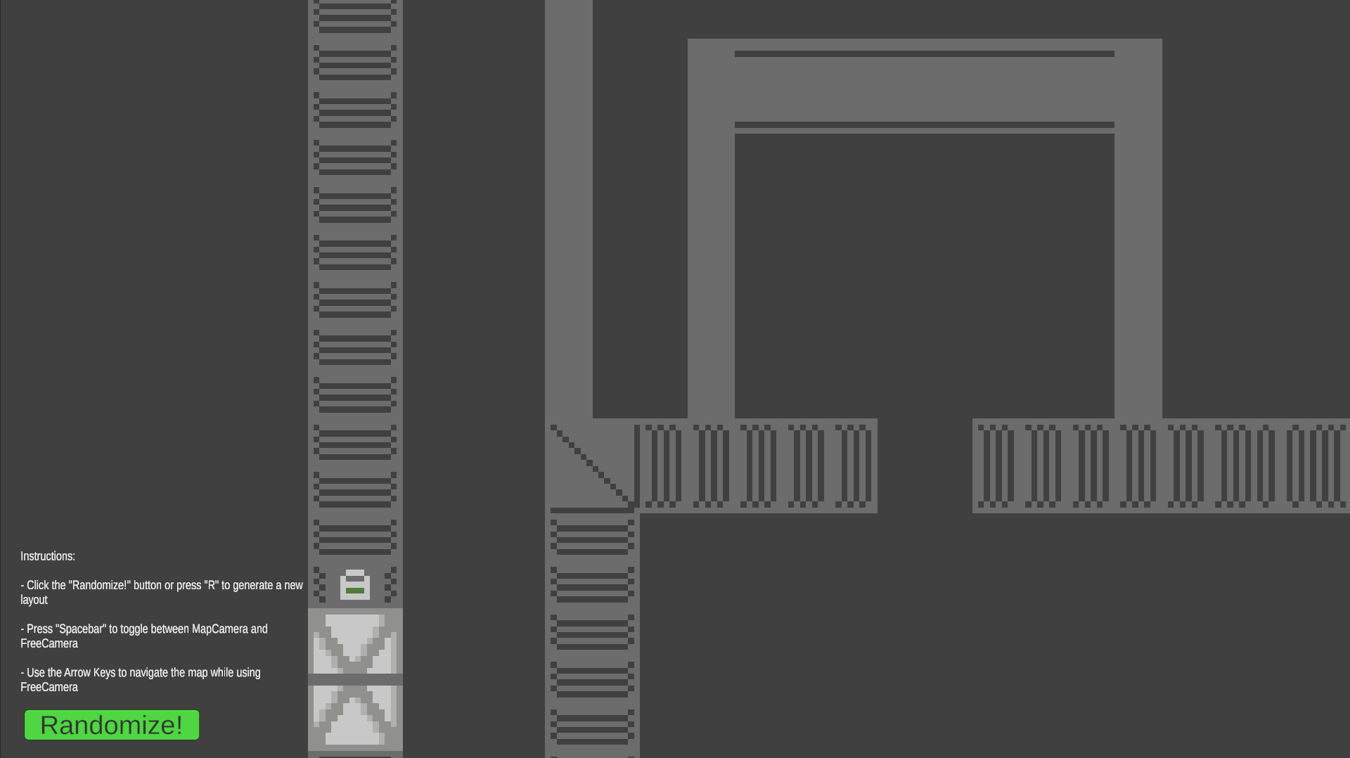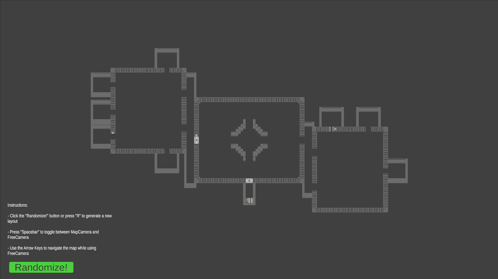 You can randomize layouts, inspect room connections, and switch between a static overview and a free camera for close inspection.